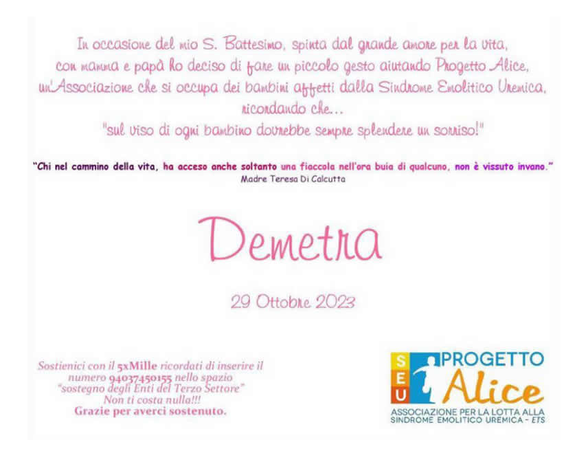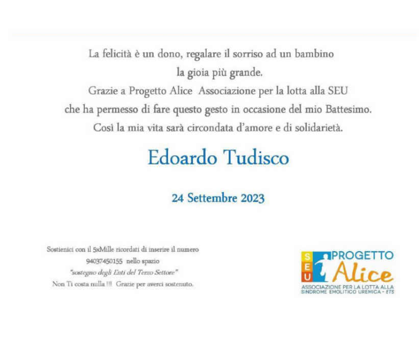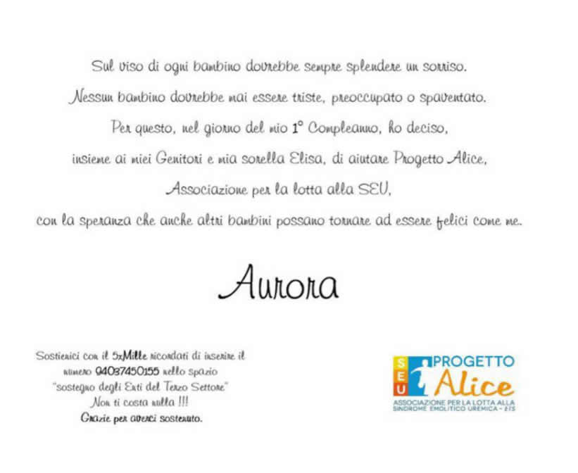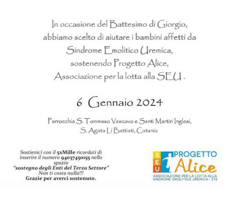 Per ogni tua ricorrenza (battesimo, comunione, cresima, matrimonio, compleanno, laurea), puoi sostituire bomboniere e regali con una donazione a Progetto Alice Associazione per la lotta alla SEU.