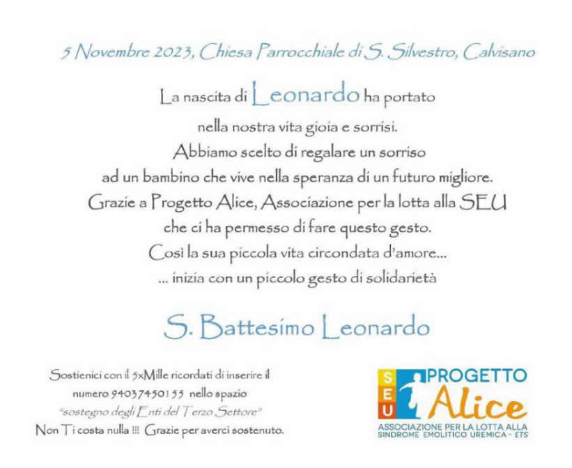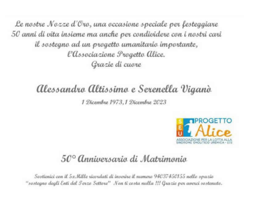 Per ogni tua ricorrenza (battesimo, comunione, cresima, matrimonio, compleanno, laurea), puoi sostituire bomboniere e regali con una donazione a Progetto Alice Associazione per la lotta alla SEU.